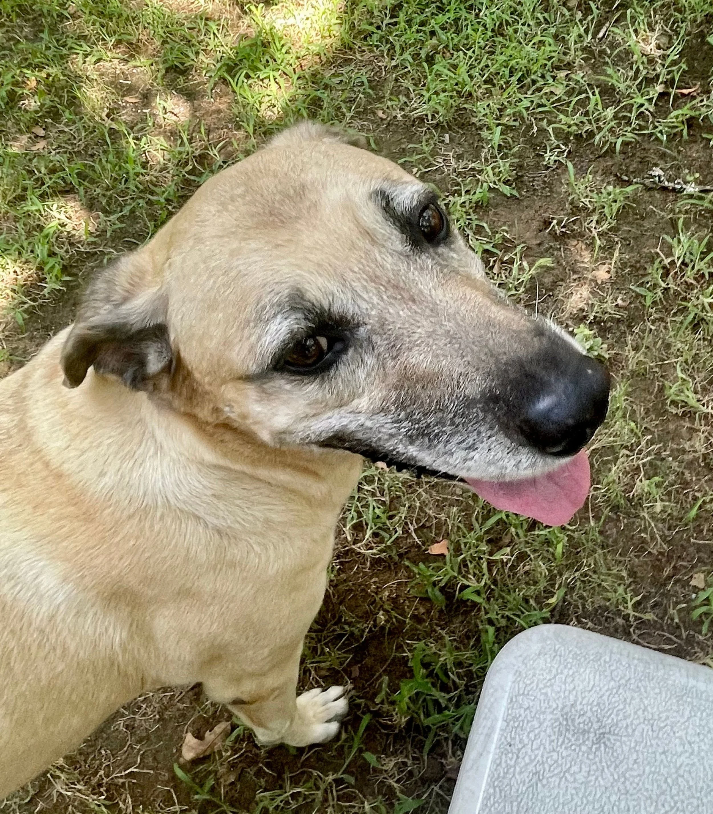 Buda (short for Boudica) is a 13-year-old black mouth cur mix, spayed female. She is an excellent dog, has a strong personality, and character. You may think, 13 years old… yep, she is still active. At this age, it is not surprising that Buda is taking medication and on prescription food for her liver.